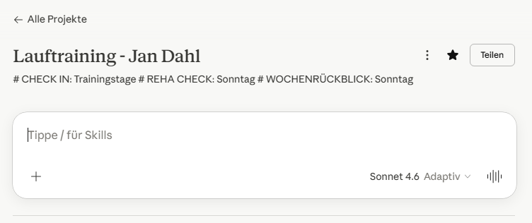 Claude Projects ist eine Funktion in claude.ai, die persistenten Kontext über einzelne Gespräche hinaus ermöglicht. Statt bei jedem Gespräch von vorne anzufangen, kennt das System meinen Hintergrund, meinen Trainingsstand und meine Ziele — dauerhaft. Dieser Kontext umfasst Athletenprofil (FTP, Körpergewicht, VDOT, Wochenlimits, Power-Zonen), aktuellen Saisonstatus mit Wettkampfterminen, alle laufenden Reha-Programme mit Gate-Status, Methodik-Definitionen, HRV-Steuerungsregeln und das vollständige Supplement-Protokoll.