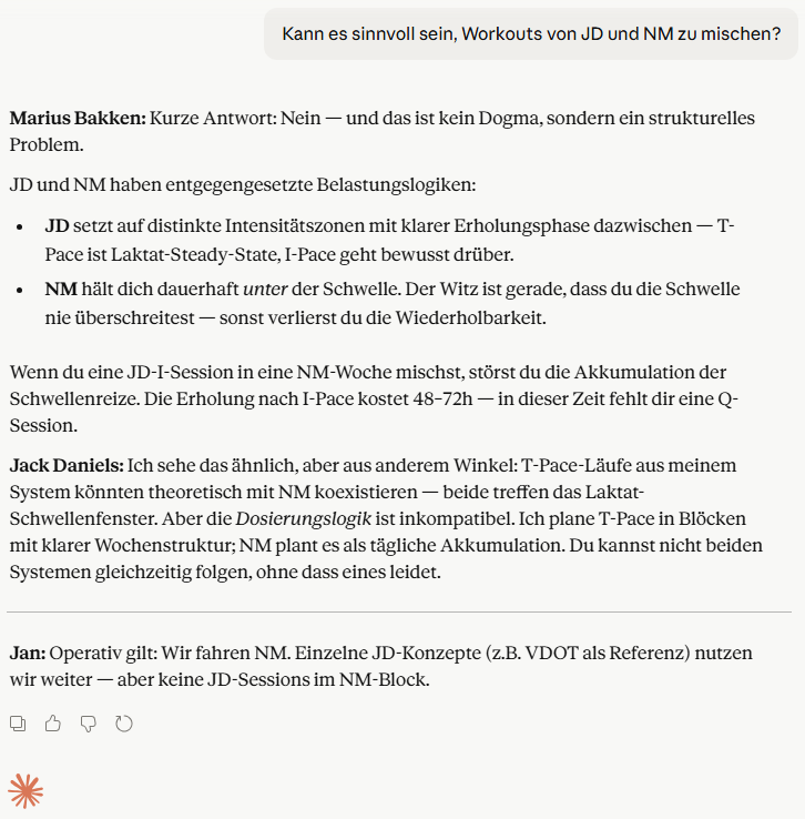 Jack kann auf Knopfdruck erklären, warum ein T-Pace-Lauf über zwanzig Minuten physiologisch anders wirkt als I-Pace-Intervalle über fünf Minuten, wie Daniels‘ Phasenstruktur (Phase 1–4) eine Saison aufbaut, und wann der Wechsel von einer Phase zur nächsten sinnvoll ist. Wenn die Methode wechselt — weil sich Ziele ändern, weil nach einem Wettkampfzyklus etwas anderes ausprobiert werden soll — übernimmt Jack die Beratung. Jan setzt die Entscheidungen operativ um. Das gesamte System bleibt unverändert.