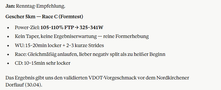 In den Tagen vor einem Rennen übernimmt Jan die Feinplanung: Tapering, letzte Aktivierungseinheiten, Ziel-Power für den Wettkampf auf Basis meiner aktuellen Form. Nach dem Rennen analysiert er Leistung gegen Prognose und zieht Schlüsse für den Folgeblock.