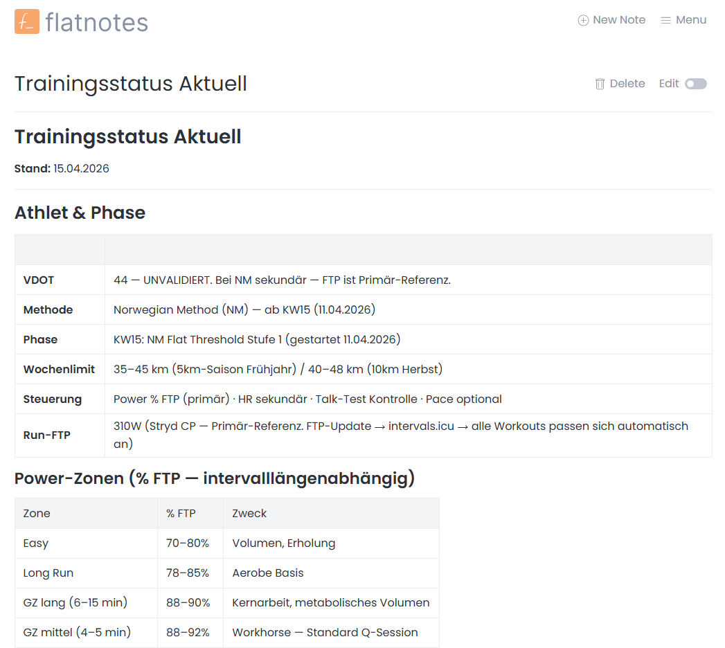 Flatnotes ist mein lebendes Gedächtnis für das System. Trainingsstatus, Saisonplanung, Reha-Protokolle — alles liegt dort in strukturierten Markdown-Dokumenten. Claude liest und schreibt diese Dokumente als Teil normaler Interaktionen. Wenn Jan nach einem Wochenrückblick den Trainingsstatus aktualisiert, passiert das in Flatnotes — nicht nur als Antwort in der Chat-Oberfläche.