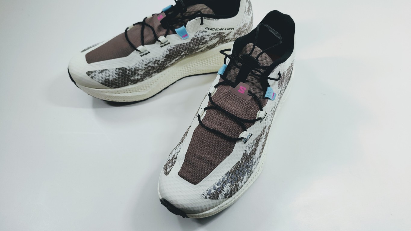 Der Aero Blaze 3 GRVL kommt mit klassischen Schnürsenkeln und Ösen — vertraut, unkompliziert, funktioniert. Der Aero Glide 4 GRVL macht hier einen Schnitt: QuickLace Neo, Salomons Kordelsystem, das man bisher vor allem von Trail- und Outdoorschuhen kennt.